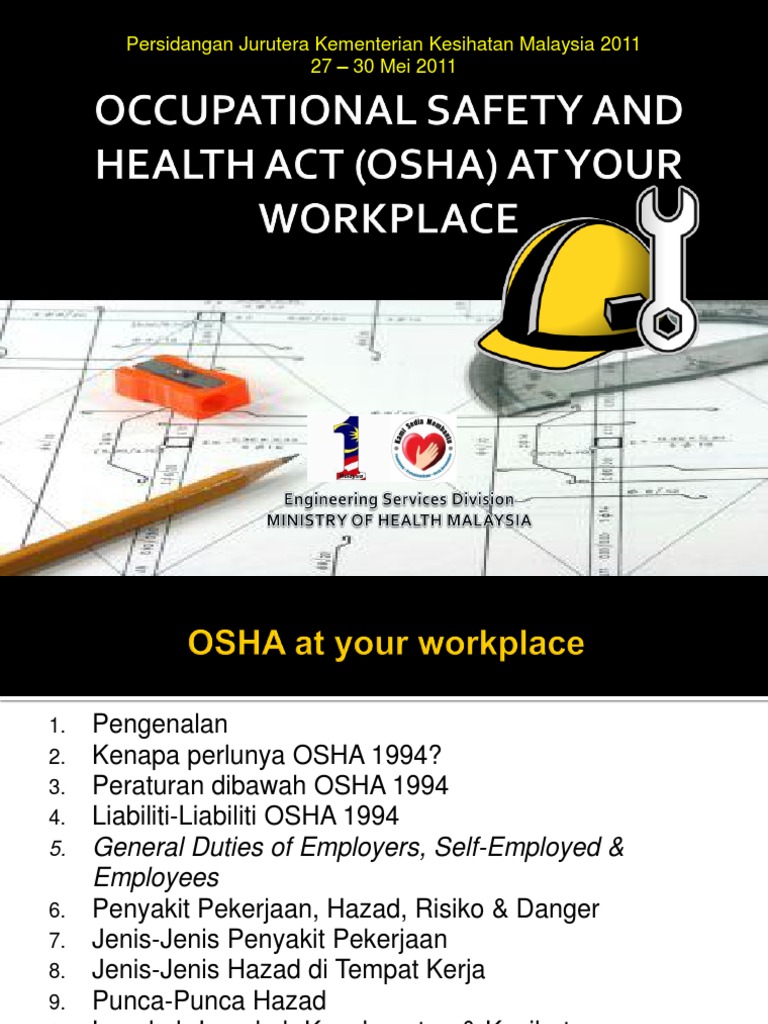 Occupational Safety And Health Act Malaysia - Occupational safety and health (osh) practices and operational performance in malaysian manufacturing sector.. The act created the occupational safety and health administration (osha), an agency of the department of labor. Occupational safety and health administration (osha): The occupational safety and health act 1994 (malay: Occupational safety & health (osh) is responsible for making sure that working environments are safe and healthy. In an operational analysis report of the osh regulations (2000) has found that 80 percent of workplace investigated failed to adhere fully.